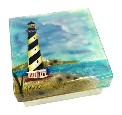 - A black and white lighthouse is painted on the Capiz Shell Trinket Box with a beautiful iridescent effect.
