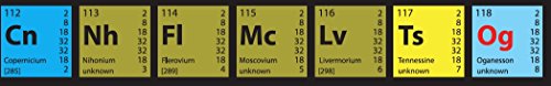 This poster is the 2017 Periodic Table of Elements. It includes the latest Elements as follows: Copernicium 112 Cn, Nihonium 113 Nh, Flerovium 114 Fl, Moscovium 115 Mc, Livermorium 116 Lv, Tennessine 117 Ts, and Oganesson 118 Og. Print quality paper stock.