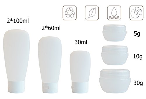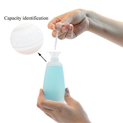 - 6 kinds of capacity, the largest is 3.3 ounces, the maximum capacity allowed in the packaging. Perfect for different cosmetics, such as shampoo, body lotion, cleansing cream, sunscreen and other liquid toiletries. Can also be used in the kitchen, such as syrup, tomato sauce, salad dressing and so on.