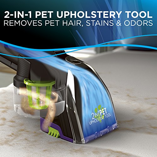 Feature : Our best deep cleaning system for pet messes includes Professional Pet Urine Eliminator Oxy Formula, 2-in-1 Upholstery Tool, CleanShot Pretreater, and EZ Clean Brush Roll Cover / CleanShot Pretreater attacks and removes pet spots and stains / 2-in-1 Pet Upholstery Tool removes pet hair, stains, and odors from upholstery / Carpets dry in about an hour with Express Clean Mode / Includes trial size of Bissell Professional Pet Urine Eliminator Oxy, model 1990. Our best deep cleaning formula for pet odors and stains, even tackles skunk odor