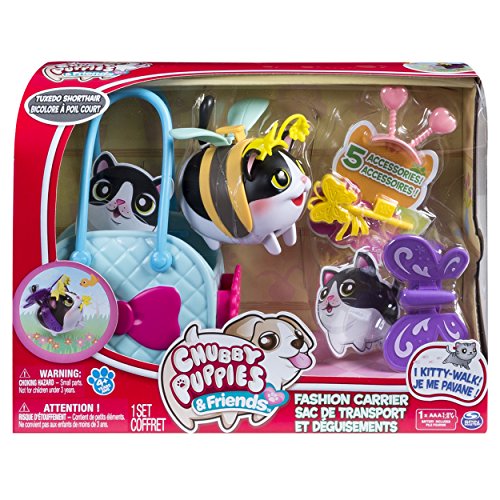 Chubby Puppies and Friends are stumbling, fumbling, tumbling cuteness you’ll fall for! Now you can dress Chubby Puppies up with their own fashion theme set. This Tuxedo Shorthair loves to play dress up with her assortment of wings! Dress her up in adorable butterfly and bee wing costumes. There are even cute antennas for her head to complete the look. It’s cuteness overload! These fumbling, tumbling friends love to run after their toys. The Tuxedo Shorthair comes with a special Butterfly Wand fashion accessory that she holds in her mouth. Give her a lift in her cute carrier or easily fit all of her accessories inside to take wherever you go! Put on a Chubby Puppies fashion show by collecting the entire line of Fashion Set Carrier Pups, including a Labrador, Boxer and Rosy Satin Bunny. Bring home the undeniable cuteness of Chubby Puppies and adopt your Tuxedo Shorthair, today!Feature