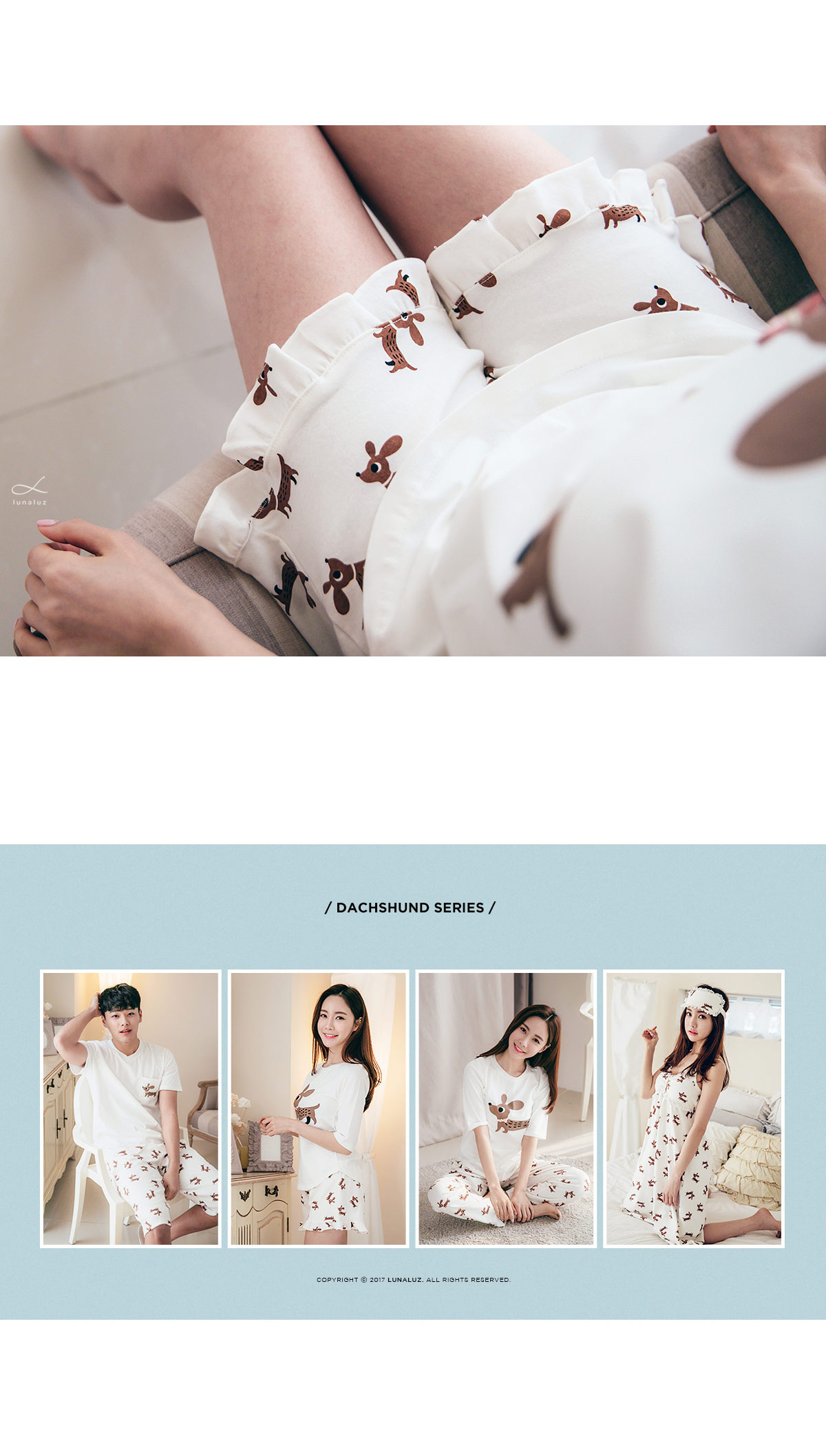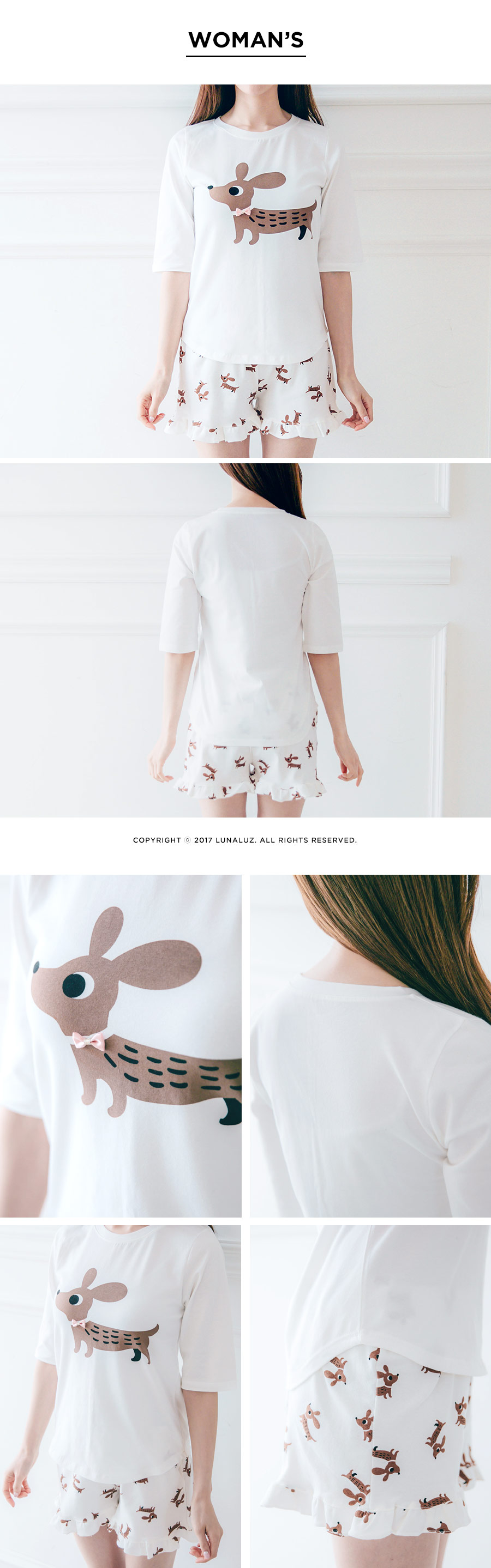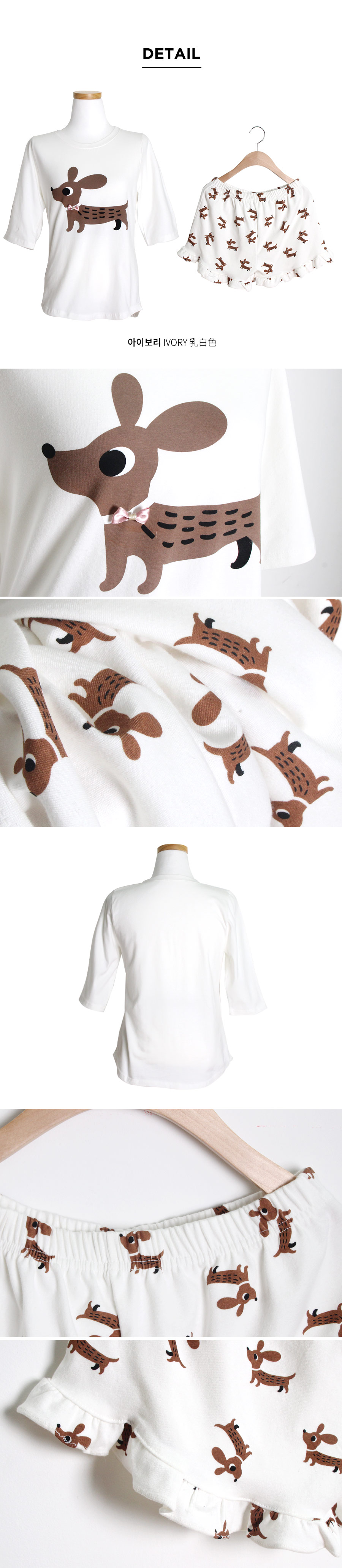 소재가 좋은 싱글 다이마루 소재로 제작한 홈웨어에요. 신축성 있고 탄탄한 소재감으로 입어 보셨을 때 피부에 감기는 느낌 또한 좋답니다. 아이보리 컬러의 베이스 위에 브라운 컬러의 귀여운 강아지 프린팅으로 포인트를 주었어요. 귀엽게 연출하기 좋은 홈웨어 스타일로 상의 소매는 7부 기장으로 더 발랄 해 보이는데요. 밑단은 라운드로 포인트를 주어 디테일 하나하나 포인트를 주었어요. 상의의 가운데는 커다랗게 닥스훈트 프린팅을 넣어주고, 깜찍한 쁘띠 리본을 목에 달아주어 더 귀여워요. 하의는 3부 기장으로 짧고 발랄하게 디자인 하였는데요. 하단에 프릴을 달아주어 러블리해 보인답니다. 착용했을 때, 더 예쁜 홈웨어에요~ 퀄리티 좋은 소재와 귀엽게 입기 좋은 스타일로 추천해 드리고 싶어요. 100%국내 제작으로 컬러감과 소재, 디자인의 퀄리티가 높습니다. Size는 55size까지 커버 가능한 free사이즈 입니다.