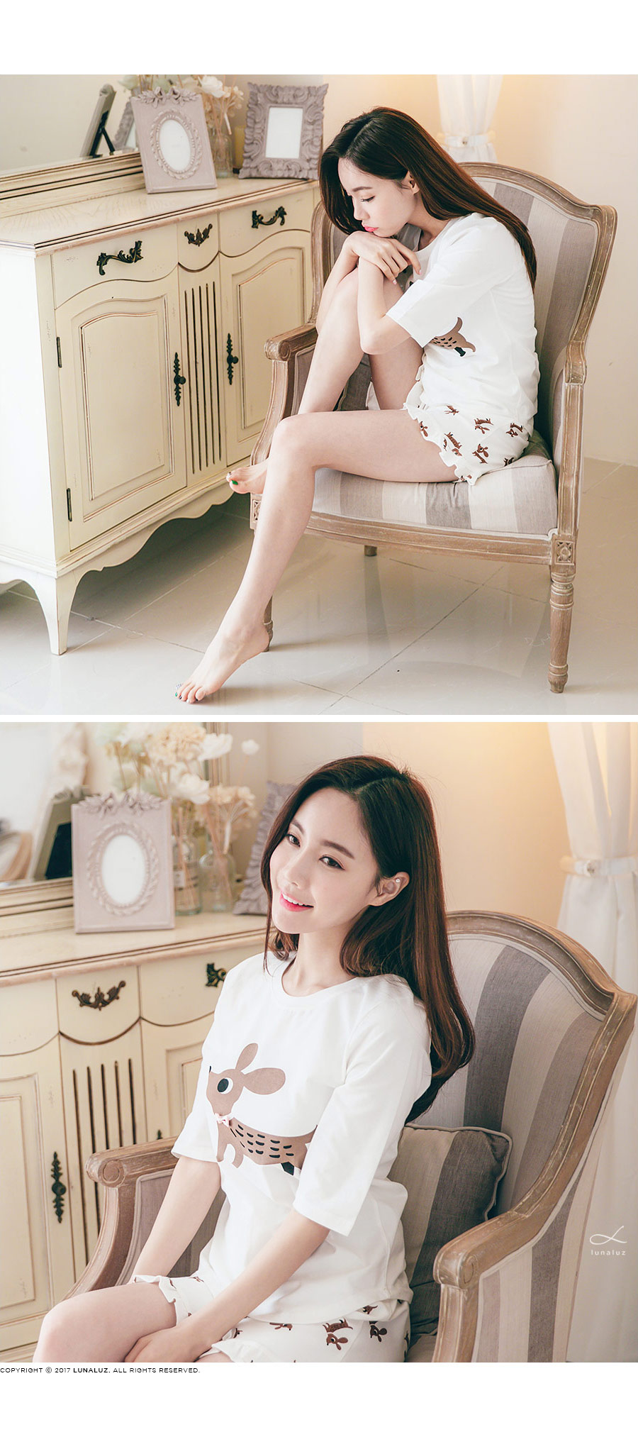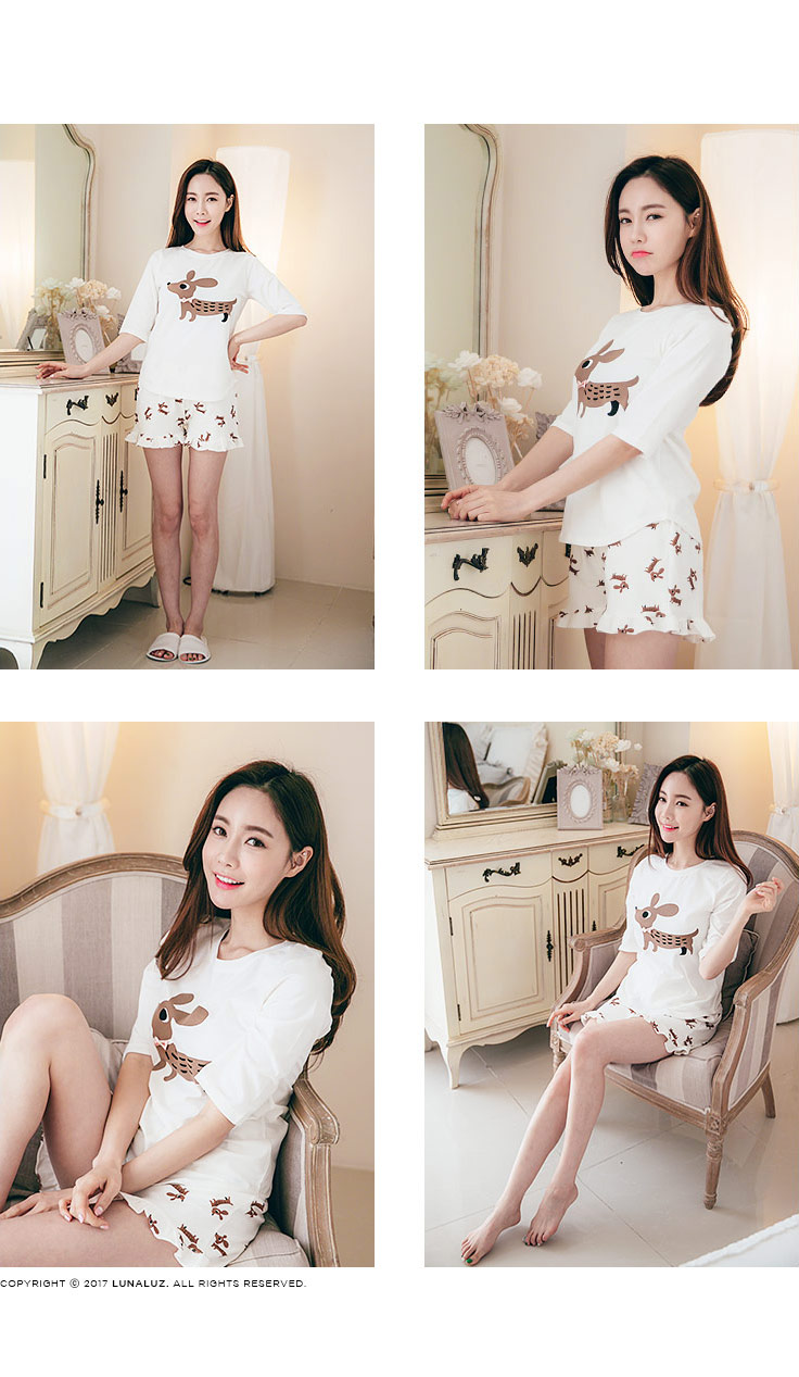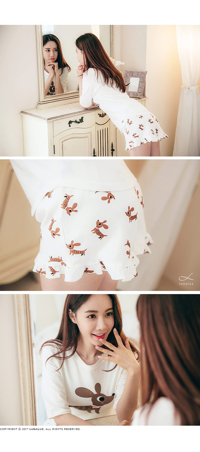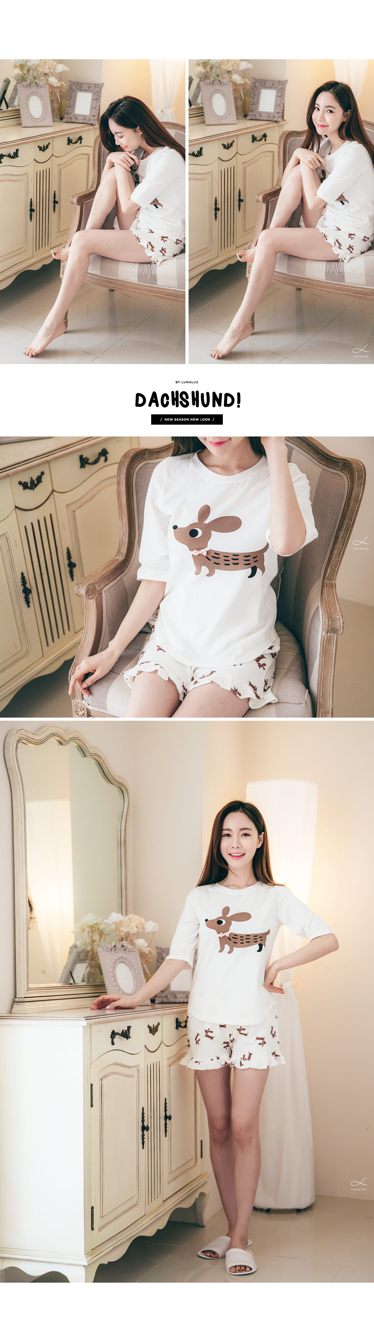 소재가 좋은 싱글 다이마루 소재로 제작한 홈웨어에요. 신축성 있고 탄탄한 소재감으로 입어 보셨을 때 피부에 감기는 느낌 또한 좋답니다. 아이보리 컬러의 베이스 위에 브라운 컬러의 귀여운 강아지 프린팅으로 포인트를 주었어요. 귀엽게 연출하기 좋은 홈웨어 스타일로 상의 소매는 7부 기장으로 더 발랄 해 보이는데요. 밑단은 라운드로 포인트를 주어 디테일 하나하나 포인트를 주었어요. 상의의 가운데는 커다랗게 닥스훈트 프린팅을 넣어주고, 깜찍한 쁘띠 리본을 목에 달아주어 더 귀여워요. 하의는 3부 기장으로 짧고 발랄하게 디자인 하였는데요. 하단에 프릴을 달아주어 러블리해 보인답니다. 착용했을 때, 더 예쁜 홈웨어에요~ 퀄리티 좋은 소재와 귀엽게 입기 좋은 스타일로 추천해 드리고 싶어요. 100%국내 제작으로 컬러감과 소재, 디자인의 퀄리티가 높습니다. Size는 55size까지 커버 가능한 free사이즈 입니다.