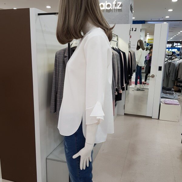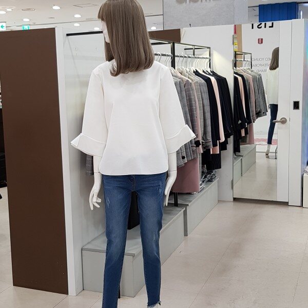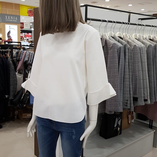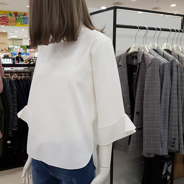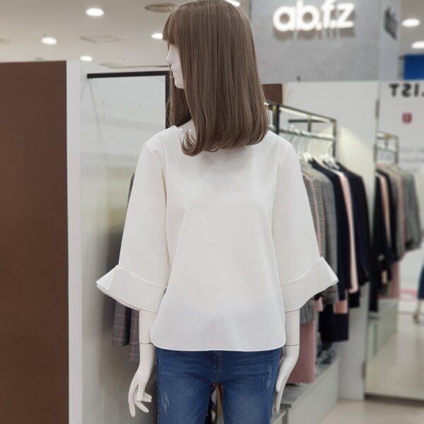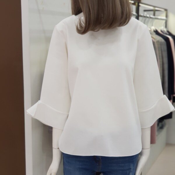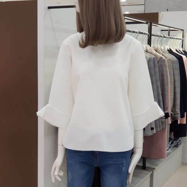 소매자락에 하늘하늘 달린 러플이 사랑스러운 티셔츠입니다.과하지 않아 여성스럽고 고급스러운 분위기가 물씬 풍기는 상품입니다.여성스러운 무드로 청바지, 원피스, 스커트 등 두루두루 코디 가능한 상품입니다.