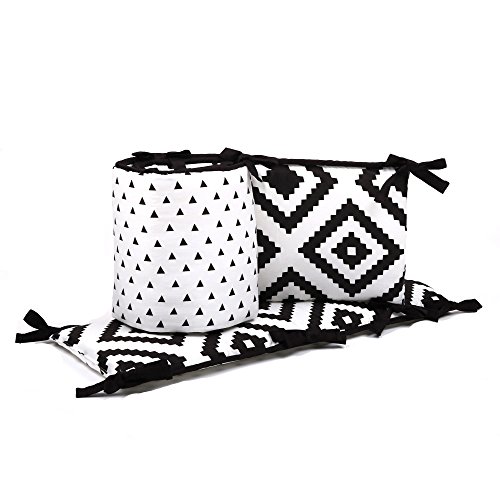 -. Feature : This contemporary Peanut Shell reversible crib bumper features triangle and tile P.R.Ints in black and white / Fabrics are 100% cotton sateen, a weave that results in a bright satin-like appearance and feel, providing the optimal mix of durability, beauty, breathability, and ease of care; polyester fiber fill provides the perfect amount of cushioning; machine wash and dry / Reversible crib bumper comes in 4 separate pieces enabling you to vary the layout; some prefer one of the patterns to be facing in from all sides; others prefer to mix them up, with one pattern facing in from the ends and the other pattern facing in from the sides / Designed to fit a standard size crib with a 28 by 52 inch mattress; bumper ties at top and bottom of bumpers assure a safe and secure fit every time / Coordinating blankets, crib skirts, quilts, sheets, changing pad covers, window treatments and other accessories are available from The Peanut Shell to create your perfect nursery