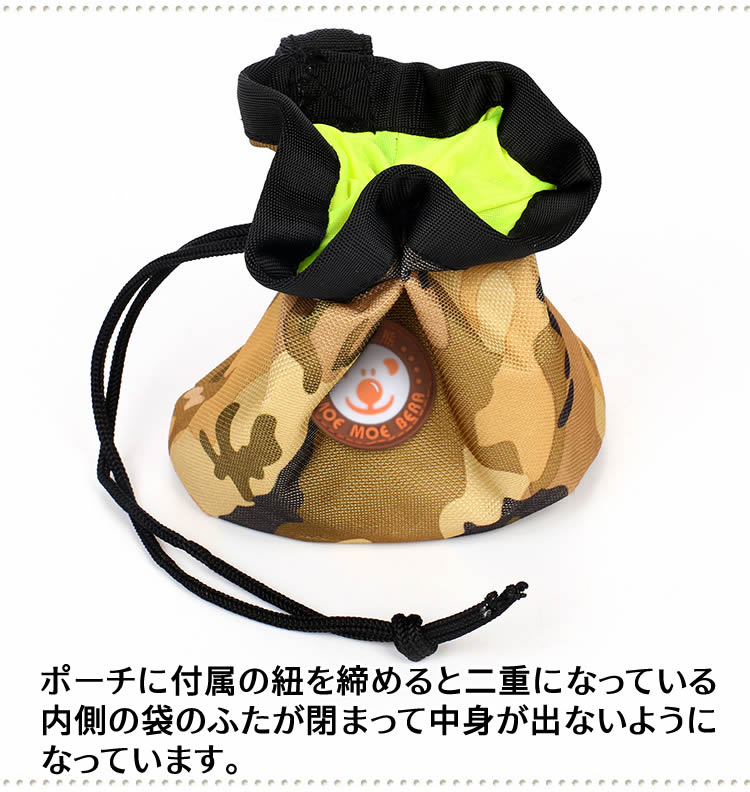 ポーチに付属の紐を締めると二重になっている内側の袋のふたが閉まって中身が出ないようになっています。