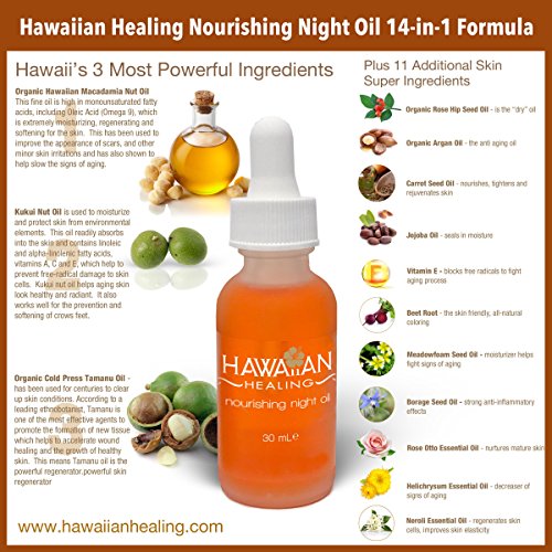 - Hawaiian Healing Nourishing Night Oil is a luxury oil for your face and neck areas, formulated with only the best organic and natural ingredients from Hawaii and around the world. Macadamia nut oil has also shown to slow the signs of aging. It has been used to help improve the appearance of scars, sunburn and other minor skin irritations.