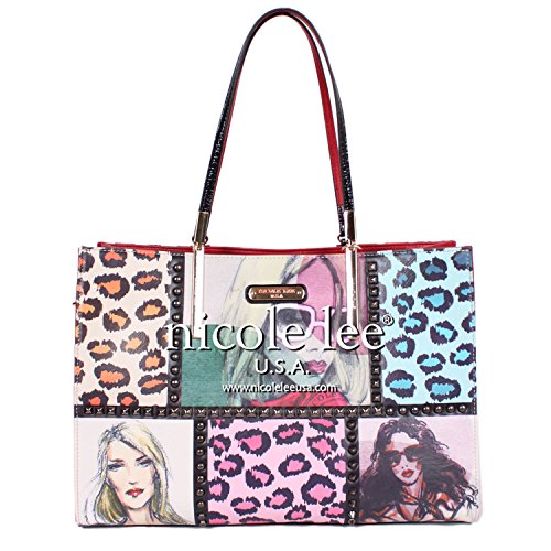 - Feature : Carry the Nicole Lee Sketch Book Print Satchel Bag for impeccable and vibrant style. / Exterior features: made of faux leather, Nicole Lee's Sketch Book print on front and back, faux leather sides, gold-tone hardware, studs embellishments, dual top handles, NL authenthic medallion on front handle, magnetic snap closure and Nicole Lee signature nameplate at front. / Interior features: zip wall pocket with NL nameplate at back, double open wall pockets at front and polka dots print with NL logo nylon lining. / Faux leather handles with 10 inch drop. / Includes adjustable and detachable 30 - 57 inch shoulder strap.