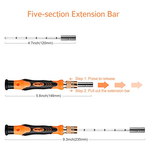 - FLEXIBLE SHAFT & ADJUSTABLE EXTENSION BAR: Allowing you to reach some blind angle screws which are not on the surface. It’s suitable for you to repair your electronics.