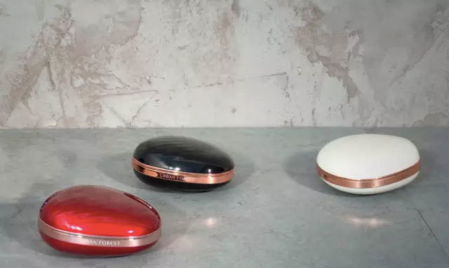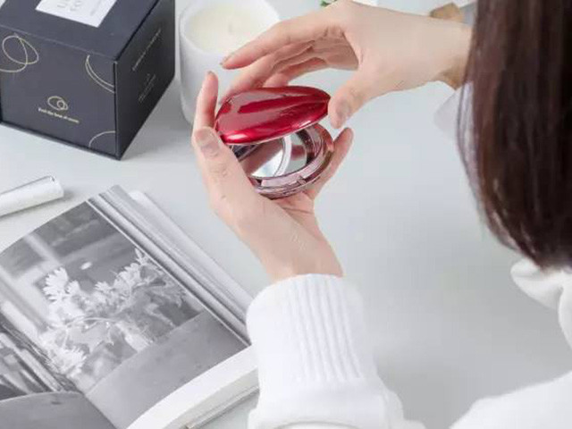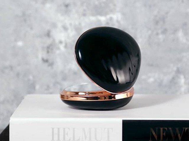 表面采用耐磨的珠光烤漆,中圈采用镀玫瑰金镶边,有白、黑、红三色,简直就是个大宝石,很多大牌的粉底盒都采用了类似的设计。