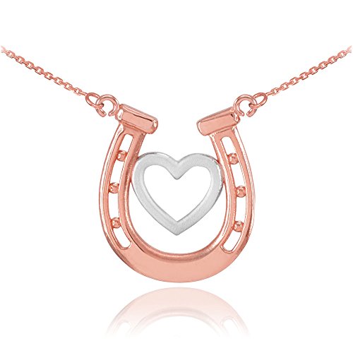 -. Feature : good luck charm horseshoe with heart pendant doubled-mounted on either ends of dainty 14k rose gold chain necklace / finely handcrafted with solid 14 karat 2-tone rose gold and white gold in polished finish / comes with free special gift packaging / made in the USA yet offered at factory direct jewelry P.R.Ice / ships from the manufacturer directly to the customers