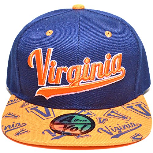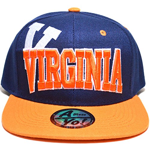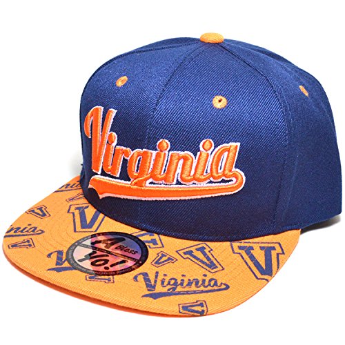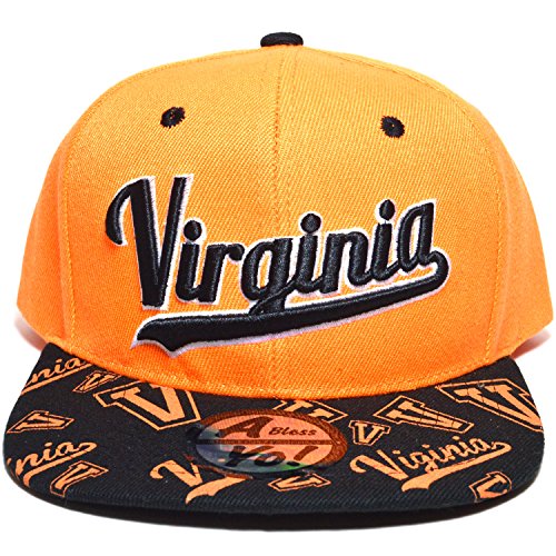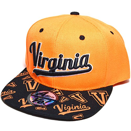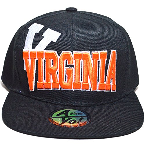 Binding : Apparel Product Description Virginia or VIRGINIA Embroidered Twill Bill Flat Visor Snapback Basketball Baseball Football Golf Fashion Sports Snap Back Golf Cap hat AYO3057 Structured Firm Front 6 Panel Cap with 6 Embroidered Eyelets Snap back Flat Bill Visor Twill Cap Durable Golf Baseball Sports Fashion Hat Wear caps hats Material : 100% Acrylic [ Made by High Quality Premium Fabric ] Adjustable : Plastic Snap Back / Men Women Fashion Accessories Head Wear ! One size fits most with adjustable Plastic Snap, fitting up to size 7 1/2 ~ x Large Crown measures 4 3/4 inches deep. [ 8(W) X 10.5(L) X 4.75(H) inches ] Bill measures 2 3/4 inches long, constructed, high profile, stiff and flat ! 0