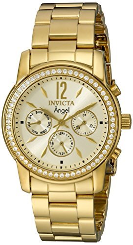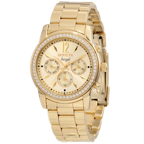 Gold-plated stainless steel case and bracelet. Fixed gold-plated bezel set with crystals. Champagne dial with gold-tone hands and index hour markers. An Arabic numeral marks the 12 o'clock position. Minute markers around the outer rim. Dial Type: Analog. Three multi-function sub-dials displaying: 24 hour, date and day of the week. Quartz movement. Scratch resistant flame fusion crystal. Pull / push crown. Solid case back. Case diameter: 39 mm. Case thickness: 12 mm. Round case shape. Band width: 20 mm. Band length: 8.75 inches. Fold over clasp with safety release. Water resistant at 50 meters / 165 feet. Functions: date, day, hour, minute, second, 24 hour. Casual watch style. Invicta Angel Multi-Function Champagne Dial Gold-plated Ladies Watch 11770.Feature