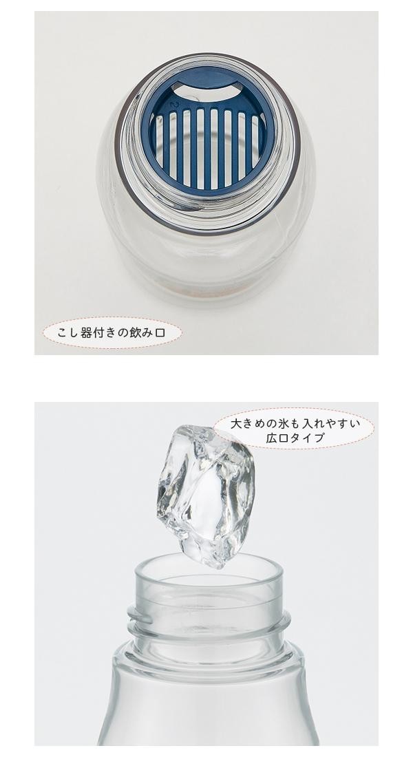 | フタを開けてすぐ飲める直飲みタイプ。ネジ式のフタなので水もれしにくく、持ちやすい形状です。液体だけが飲めるこし器付き飲み口なので、フレーバーウォーターなどにもピッタリ!! |