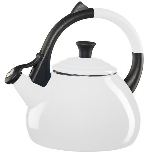 Le Creuset Enameled Steel 1.9 Quart Oolong Tea Kettle,White With classic and modern shapes, there''s a Le Creuset kettle to fit into any kitchen design scheme. Also convenient to boil water for oatmeal or french press coffee, a Le Creuset kettle is an easy way to add a small dash of color to any kitchen. Features Single-one whistle alerts when water has reached a rolling boilGenerous base size for greater contact with heating element so water boils quicklyConvenient quick heating with superior heat distributionFixed whistle can be easily flipped open for pouringStainless steel handle brackets for secure handlingHeat-resistant ergonomic handle for safe pouringKettle capacity marked on the base for quick referenceCan be used on any heat source (gas, electric, ceramic, halogen, induction) Heating tips When filling the kettle with water, only fill water above the first layer of holes on the interior of the spout (see diagram on box for more information). For efficient and safe boiling, always use burner a similar in size to the base of the kettle. Cleaning and care Do not bang the teakettle down onto a stove''s surface or work surface. Repeated banging may damage the exterior enamel. Do not place the kettle on the heat source without having water in the kettle. Never leave a teakettle simmering for long periods on any heat source; it may boil dry, which can result in overheating and damage to the base and enamel. Do not leave water standing in a kettle when it is not in use. A buildup of scale may occur and reduce efficiency. Before pouring from your teakettle, remove it from the burner and ensure the handle is in the upright position. Le Creuset proudly uses heat-resistant plastic on our handles and whistles. Never place in the dishwasher.To clean, simply hand-wash the kettle with hot, soapy water and dry thoroughly. A gentle kettle de-scaler may be used periodically if required.