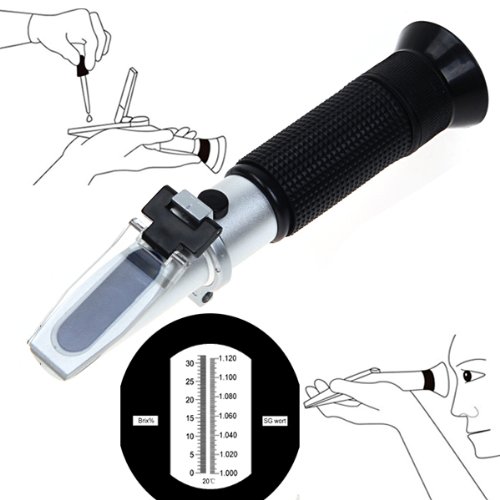 This hand-held optical refractometer measures the density of sugars in the solution and gives you an instant gravity readings at any point during the boil, or run off from the mash.