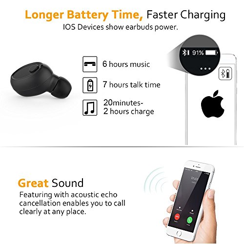 - Exceptionally long battery life of 6 hours of audio playtime at 30-40% volume, and 7 hours talk time, 1.5 hours charging time with premium built-in rechargeable lithium-poly 50mAh battery. Support IOS device power display.