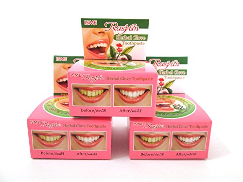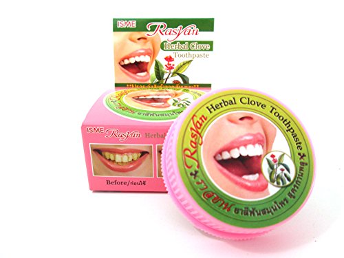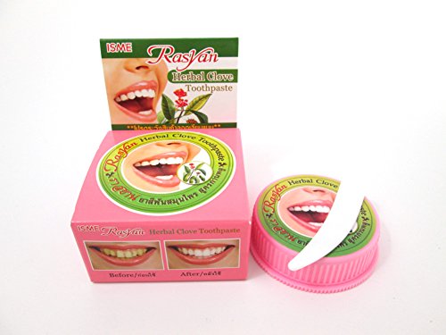 -. Binding : Health and Beauty -. Brand : Rasyan -. EAN : 6930472600740 -. Feature : Herbal clove toothpaste.Cleans and whitens teeth while freshing breath / Help to eliminate limestone from cigarette,tea,coffee / Traditional formula used for generations throughout Asia. / Reduce to have a hypersensitive tooth and anti bacteria. / 3 packs x 25g. -. Label : -- -. Manufacturer : -- -. PackageQuantity : 3 -. ProductGroup : Health and Beauty -. ProductTypeName : HEALTH_PERSONAL_CARE -. Publisher : -- -. Studio : -- -. Title : Rasyan Isme Herbal Clove Toothpaste 25g. Tooth Paste Anti Bacteria Bad Breath Decay x 3 packs