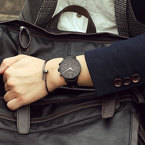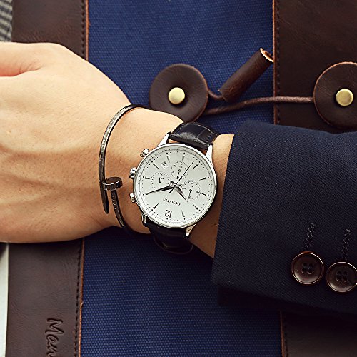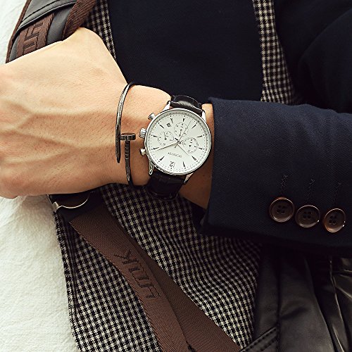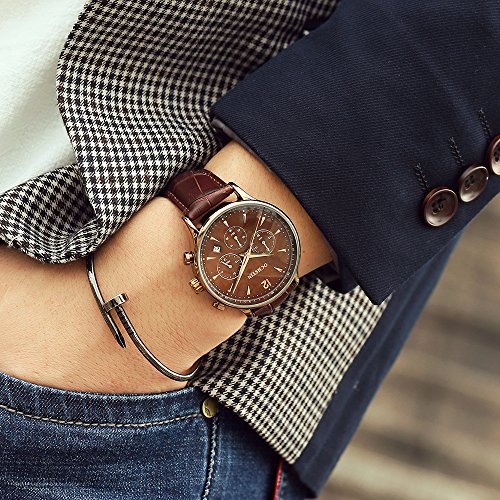 -. Feature : Classic design with fashion luxury look. / Genuine leather strap is soft and comfortable to wear. / 3 sub-dials to show: minute, second and hour. / This watch is 30M water-resistant, but not for swimming, showering. / Well packaged with box, best gift idea,Quite elegant look is easy to pair with suits and casual clothes.