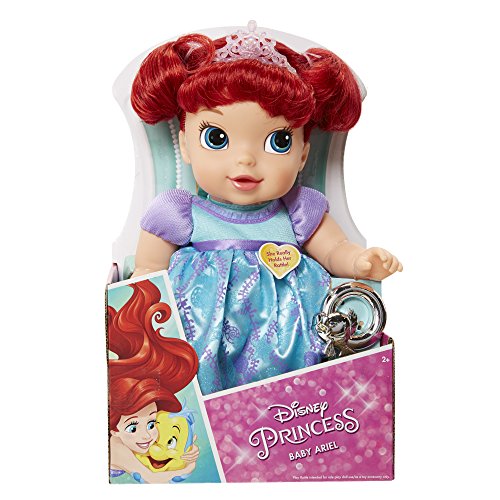 What a magical start to a sweet fairy tale friendship! Baby Princess Ariel is dressed in a royal gown and tiara making her the perfect friend to love and cuddle! Be sure to give her lots of hugs and brush her beautiful hair. And with a little help, Princess Ariel can actually hold her "Flounder-inspired rattle!" Includes: Baby Doll, Tiara and Rattle Toy.Feature