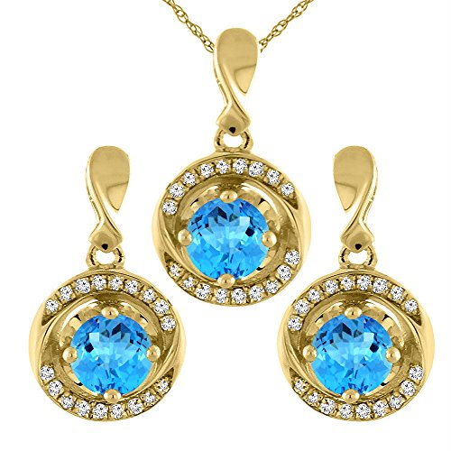 -. Title : 14K Yellow Gold Natural Swiss Blue Topaz Earrings and Pendant Set with Diamond Accents Round 4 mm