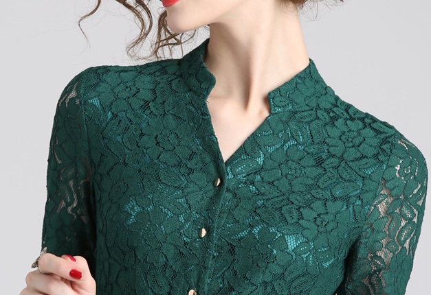 スタンドカラーとV字に開いた襟元がスッキリ小顔に見せてくれます☆