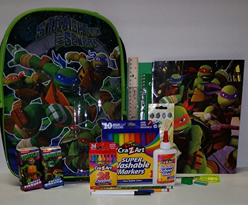 -. Feature : 20 Piece Teenage Mutant Ninja Turtle School Supply Bundle / 1 - 16"x12" Teenage Mutant Ninja Turtles Backpack / 1 Each - 70 Sheet Wide Ruled Spiral Notebook, 2 Pocket Portfolio, Teenage Mutant Ninja Turtle Folder, Ruler / 1 Each - Pack of 24 crayons, Pack of 10 Washable Markers, 1 Sheet of stickers / 1 Pencil bag containing: 2 assorted design #2 pencil, 2 pens, 1 bottle of washable school glue, 1 pair of pointed end scissors, 2 packs of Teenage Mutant Ninja Turtle tissue
