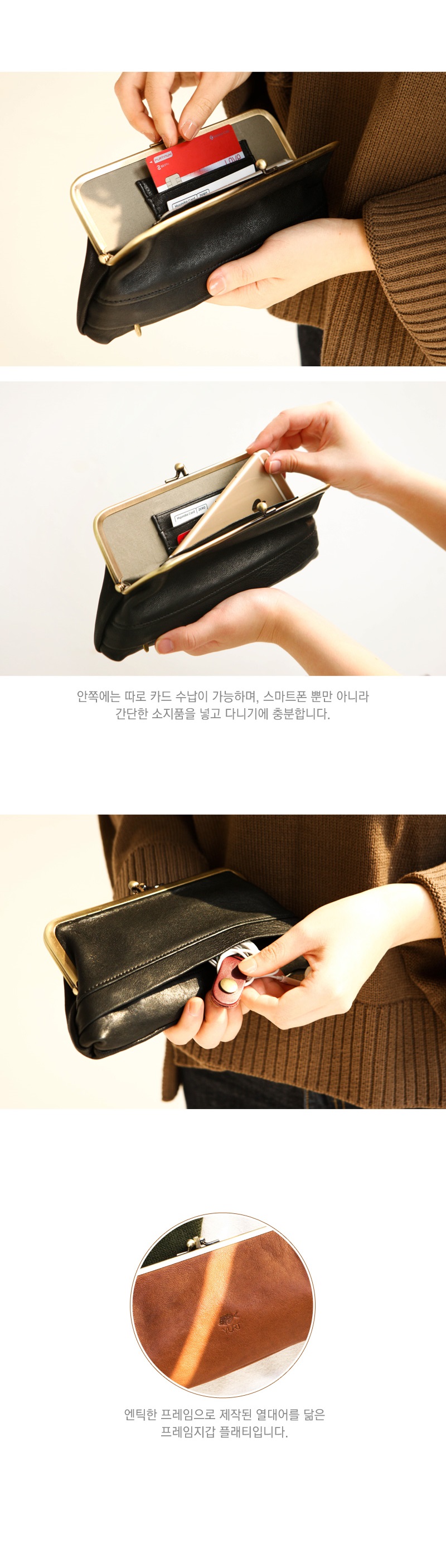 두개의 프레임 수납공간과 한개의 지퍼수납공간 총 3개의 수납공간으로 동전과 지폐뿐만 아니라 간단한 물건들을 정리해서 넣기에도 좋습니다.