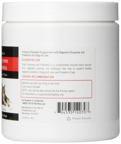 -. Binding : Misc. -. Brand : PSCPets -. Feature : Contains a concentrated blend of specialized enzymes and prebiotics to help support your dog's healthy digestive system / Perfect way to get the most out of any probiotic supplement, including PSCPets.com IntelliFlora / Probiotics are beneficial bacteria that are found in various foods and supplements -. Label : ProbioticSmart -. Manufacturer : ProbioticSmart -. Model : PSC-VP9310-Parent -. MPN : PSC-VP9310-Parent -. PackageQuantity : 1 -. PartNumber : PSC-VP9310-Parent -. ProductGroup : Pet Products -. ProductTypeName : PET_SUPPLIES -. Publisher : ProbioticSmart -. Studio : ProbioticSmart -. Title : PSCPets Daily Enzymes and Prebiotics Powder for Dogs and Cats