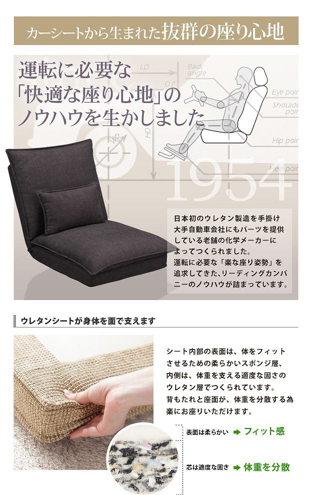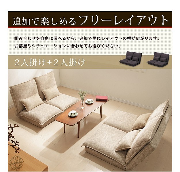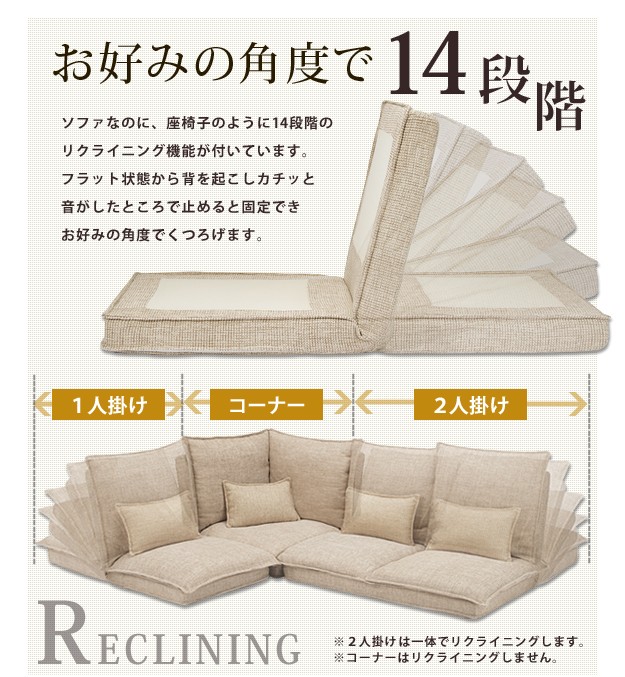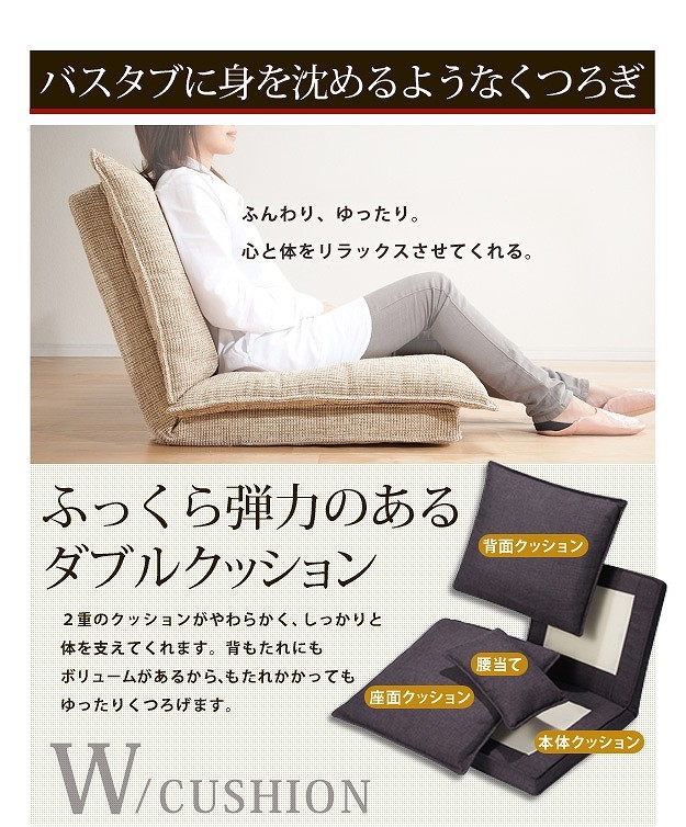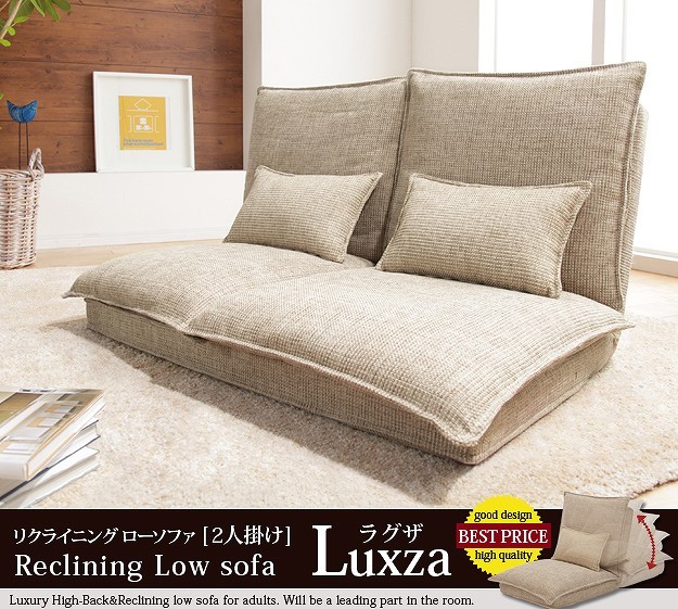 【2人掛け・単品】ハイバックのリクライニングローソファ。14段階のリクライニングでお好みのくつろぎスタイルに。ふっくらボリュームのあるダブルクッションは抜群の座り心地☆大手自動車会社にもパーツを提供している老舗の科学メーカーが「楽な座り姿勢」のノウハウを活かしてつくりました。上質で丈夫なカバーは立体的な織目。座面、背もたれ、腰当てクッションのカバーは外してドライクリーニングが可能なので、清潔に保てます。