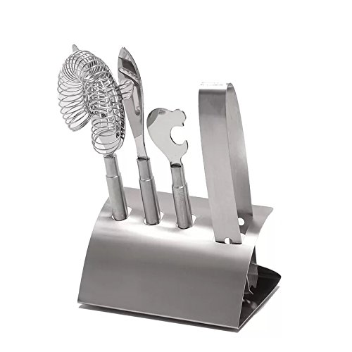 -. Brand : Mr. Ice Bucket -. Color : Chrome -. EAN : 0604034493106 -. Feature : Stainless Steel / Overall Dimensions 7'' H x 5'' W x 5'' D / Overall Product Weight 2 lb. / Pieces Included: Strainer, bottle opener, cheese knife, Ice tong, and stainless steel rack. / Bar tool set -. ProductGroup : Kitchen -. ProductTypeName : KITCHEN -. Title : 5 Piece Bar Tool Set Stainless Steel 7'' H x 5'' W x 5'' D in. -. UPC : 604034493106