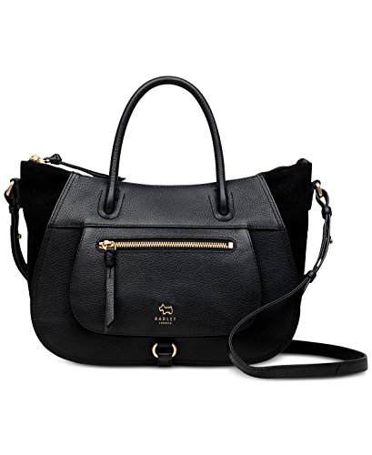 Product Description Radley London's spacious multiway satchel displays a scooped shape that mixes leather and suede for cool '70s aesthetic. Carry it by the long strap or grab-and-go handles. Medium sized bag; 12"W x 8-4/10"H x 4"D 4-4/10"L double handles; 23-2/10"L adjustable strap Zip closure Gold-tone exterior hardware, logo, hanging dog charm, buckle detail, winged sides, 1 front zip pocket 1 back slip pocket 1 interior zip pocket 2 slip pockets 1.93 lbs approximate weight Grainy leather; trim: suede 0