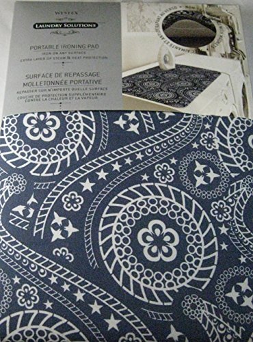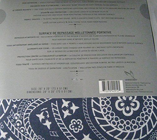 -. Binding : Kitchen -. Brand : Westex -. Color : Blue and White -. EAN : 0772270429125 -. Feature : 100% Cotton Surface and Trim / Wipe Clean with Damp Cloth / Enhanced non slip backing / 4 corner magnets provide additional anchoring / Steam and Heat Protection -. Label : Westex International -. Manufacturer : Westex International -. ProductGroup : Home -. ProductTypeName : HOME -. Publisher : Westex International -. Size : Portable Cover 29" x 20" -. Studio : Westex International -. Title : Westex Portable Ironing Pad 29" X 20" 100% Cotton Blue Floral Paisley -. UPC : 772270429125
