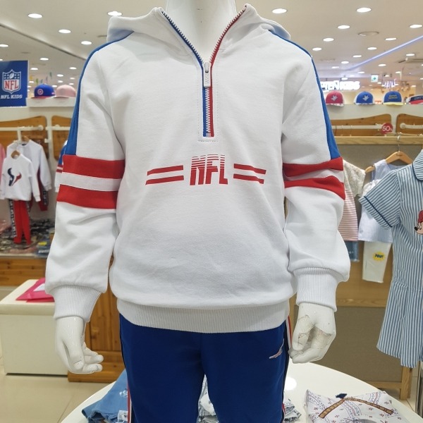 NFL 가을 신상품 !앞, 뒤판 레터링 나염이 포인트인 컬러 블록 후드 티셔츠. 걸개 위 장식 테잎과 하프 컬러 지퍼로 스포티함을 더해줌, 약기모가 있어서 보온성이 우수 !