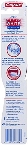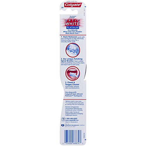 Colgate 360 Degree Optic White Platinum Manual Toothbrush features stain erasing cups that work with your toothpaste to help effectively remove surface stains, a unique spiral bristle head design to help whiten teeth by polishing away surface stains, and a cheek and tongue cleaner.