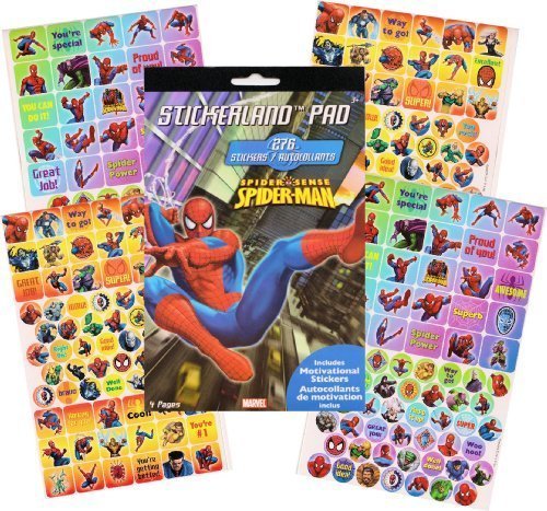 Sticker pad with 276 stickers featuring Spider-man! Sticker pad has 276 stickers and 4 pages. Stickers feature Spider-man and his friends with motivational phrases; such as "Good Job", "Excellent", "Super", "You Rock", and more! Just the right size for reward charts. Motivate you Spidy fan with these colorful reward stickers!