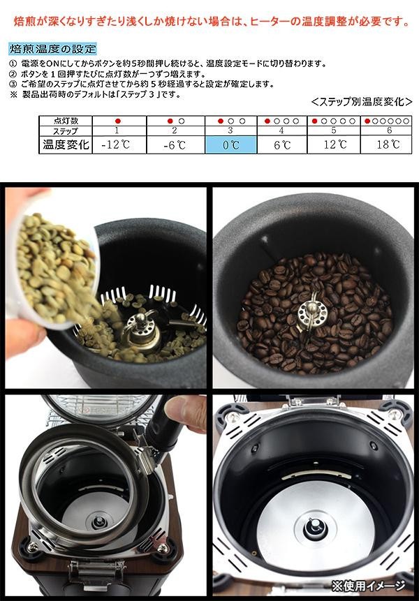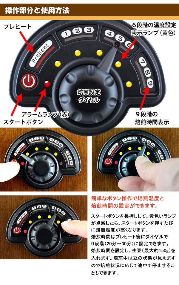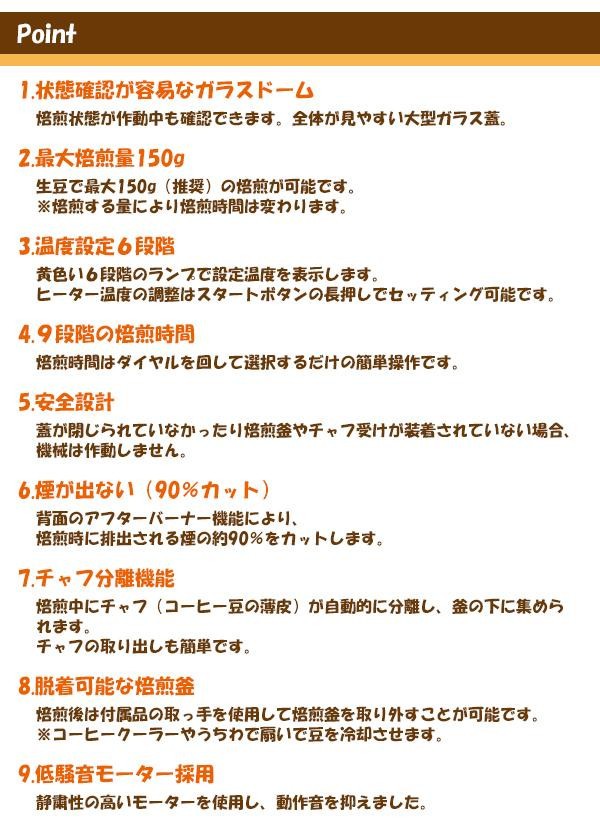 | 仕様 | 定格電源:AC100V、50/60Hz 消費電力:1100W 温度フューズ:167度 温度上昇制限:サーモスタット付 最大焙煎量:150g コード長:1.4m |