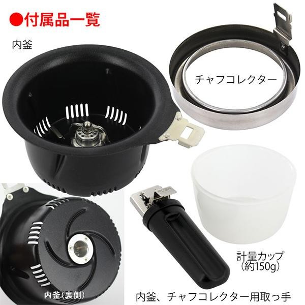 | 付属品 | 内釜 チャフコレクター(チャフ受) チャフコレクター用取っ手 計量カップ(約150g) 取扱説明書兼保証書(保証期間:1年) |
