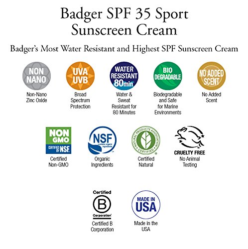 Safe, Effective, & Responsible. This is the best sport sunscreen for skiing, snowboarding, surfing, running, biking, hiking, and swimming. Formulated to protect our hardworking, hard-playing, active Badger friends everywhere. This cream-based sport sunscreen is water resistant for at least 80 minutes, protecting you from sun, wind, cold, and water while moisturizing and nourishing your skin. And it stays where you put it – so you can focus on doing your best.Feature