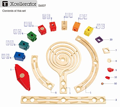 Hape Quadrilla is a High Quality Wooden Marble Run Construction System. It provides QUALITY TIME for the whole family to play together. The BEST GIFT for your loved ones. It provides endless creative building possibilities and encourages spatial thinking and problem solving. Each of the seven different colored blocks has a unique function; and it's the world's only kinetic marble run. It has won “Spiel Gut” (Good Toy) Award and Oppenheim Toy Portfolio Platinum Award. Providing over a thousand happy playing hours, Quadrilla is worth every penny. All Quadrilla marble run sets are crafted with heirloom quality birch and rubber wood for long-lasting marble racing fun. Hape Toy finishes are all non-toxic, child safe and of the highest quality. Hape constructs their toys using FSC accredited wood products. Hape toys stimulate children through every stage of development and help nurture and develop their natural abilities. All Hape products meet or exceed all applicable safety standards. Xcellerator combines speed and spin. It features a spiraling funnel, a mix of straight and curved rails and ten accelerators to challenge Quadrilla builders in new directions and dimensions. Spirals, curves, straightaways, accelerators and a seesaw combine to make Quadrilla's Xcellerator the pinnacle of speedy marble run construction sets. Quadrilla's Xcellerator will make any mopey marble put the pedal to the medal with it's velocity-increasing design. Quadrilla's Xcellerator can be combined seamlessly with Quadrilla's other marble run sets.