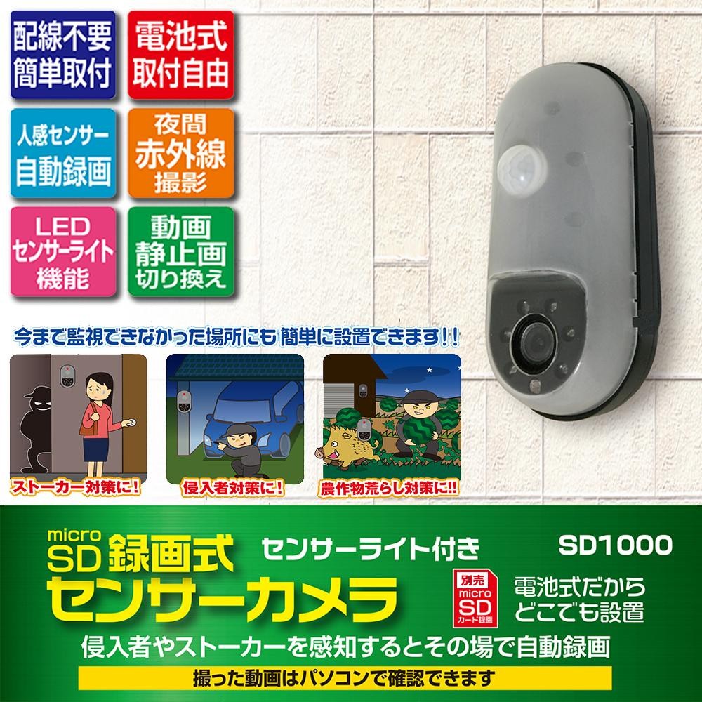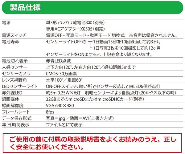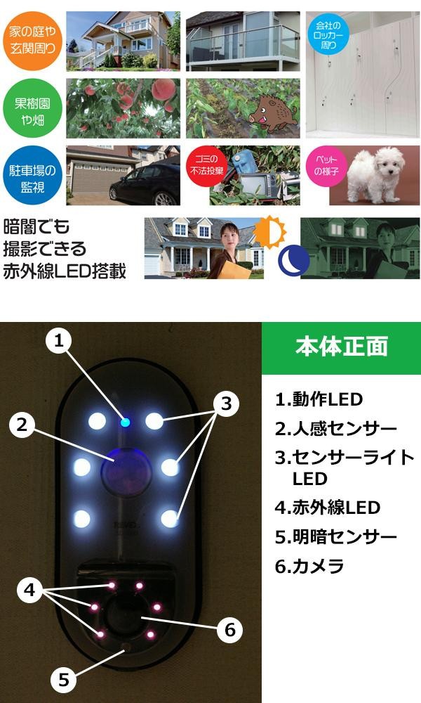 | 侵入者やストーカーを感知するとその場でmicroSDカード(別売)に自動録画します 夜間でも赤外線LEDで録画することができます LEDセンサーライト機能付きで 動画モード・静止画モードを選べます 撮った画像はパソコンで確認することができます |