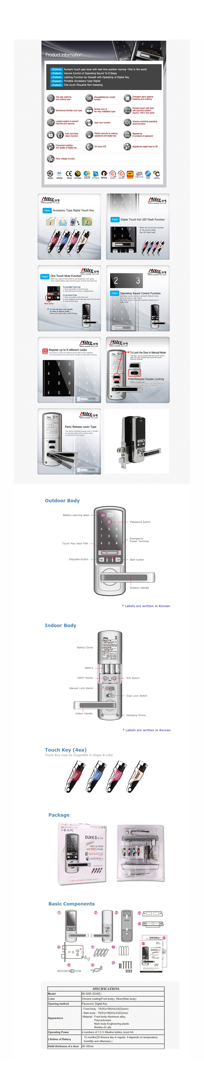 Model - Mi-5000(DUKE) Opening method - Password, Digital Key Operating Power - 4 number of 1.5 V Alkaline battery sized AA Lifetime of battery - 12 months Valid Thickness of a door 40~50mm