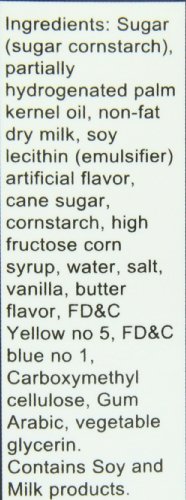 First orginial Buttercream Flavor; No Trans Fats; Glutten Free; Fruit flavors are a good source of vitiam C; 1 year shelf life p-nut and tree nut free; contains milk product