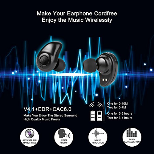 -. Feature : Cool Truly Wireless Bluetooth Headphones with advanced audio decode technology enables the connections with the devices; no more cable mess as well. / Extra Charging Case with 2000mah capacity- also as a portable power bank, not only could charge for the earbuds also for your phones; recharge the earphones about 30mins. No worry about the power off for outside or travel using. / Two Choice--Dual Earbuds Use or Single One use, Use the Two Earphones simultaneously or choose anyone at your will. / Latest Bluetooth 4.1Version assures the stable signal and streaming music; Noise Cancellation Technology filters the outside noise to ensure the clear sound quality during the calls and while listening to the music. / Design for Fitness, the special and the stabilizer design of the earbuds assure the stable and comfortable wearing, especially for the running, gym or other workout.