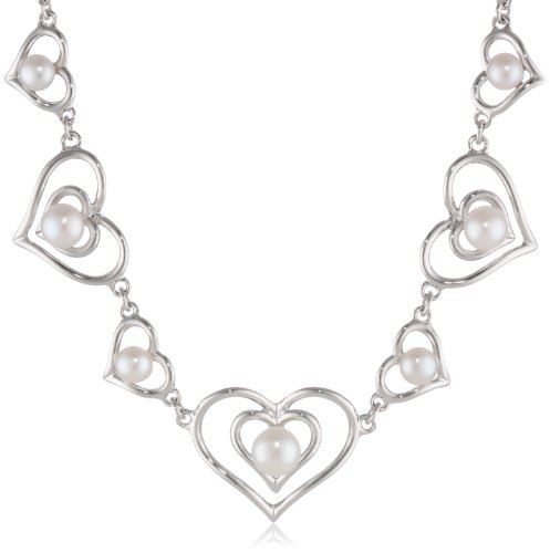 Sterling Silver Rhodium Plated Graduated Heart with Freshwater Cultured Pearl Necklace, 17"