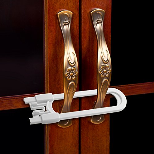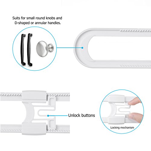◎◎Strong Features No need screw, tools or drillings. It is easy to install the lock with pressing buttons. Easy for adults to unlock, while the toddlers are hard to figure out the lock. Adjustable locking length suits for all kinds of cabinets and D-shaped door handles. No damage to the surface of the furniture, keep cabinets clean without adhesives. 4 packs of safety locks to meet your multiple uses with a preferential price. ◎◎Specifications Material: ABS Color: White Adjustable length: 5 inches
