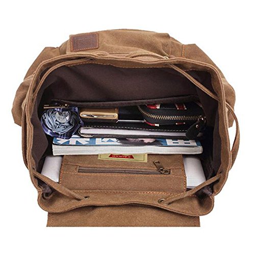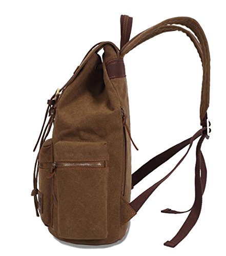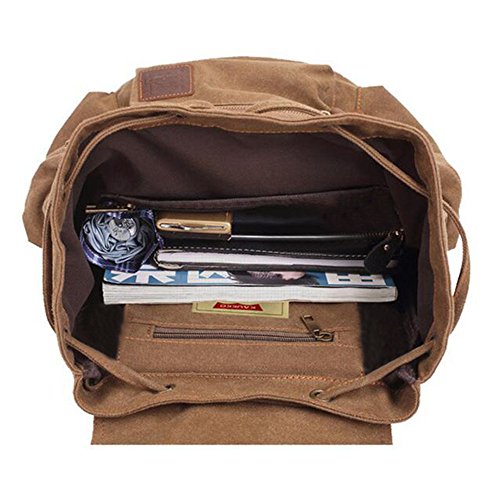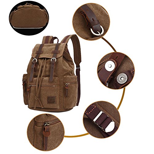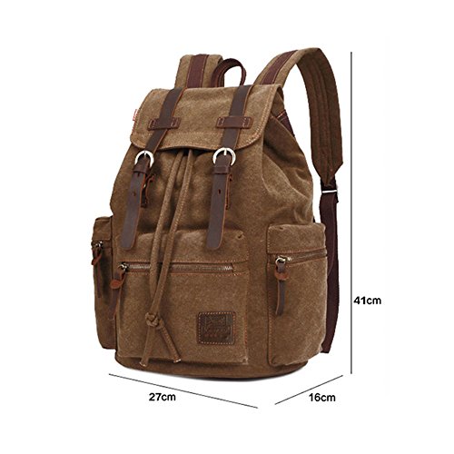 -. Feature : Dimension:18 (L)×11.5 (W)×6.8 (H) Inch ,Total Strap :35.43 (Can Be Adjusted ) / Construction:The bag's main compartment drawstring closure allowing for easy and quick access to its contents. A top flap covers and securely snaps shut via two real leather adjustable length straps. Inside the ample sized main compartment, you'll find several pockets to keep the contents organized. There's a compartment to carry a small laptop or tablet that has a Velcro closure on a wide elastic band. It will hold your laptop securely and gives you expansion room for notebooks or papers. / Exterior Features :It's made from heavy cotton canvas that's perfectly stitched at every seam for added strength and durability. The orange stitching stands out against the dark color of your pack adding to the pack's vintage charm. With its real leather straps and accents, it looks as if it came right out of an "Indiana Jones" movie. / Interior Features :Another great feature of this backpack is the way the drawstrings for the main bag hold the inner compartment closed. A piece of leather, which acts like a zipper, holds the tightened drawstrings securely closed and ensure the drawstrings are not pulled completely out of the bag. The bag has nice wide padded shoulder straps that are easy to adjust ensuring a proper fit for any size body. / Function:This Vintage Canvas Backpack is just the right size for everyday use as a day pack, for school, or as a carry-on bag when traveling. You can use this pack daily as your carry all, when riding bike, walking, or hiking. It will easily carry your laptop, phone, USB speakers, and other necessities without weighing your down.
