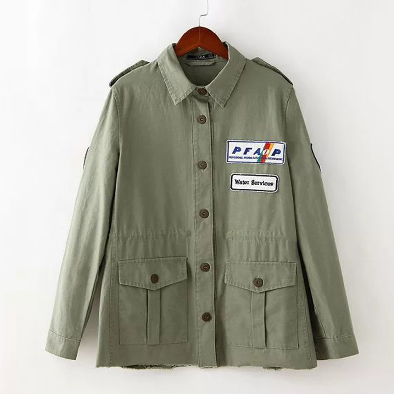 Army Green Vintage Patches Appliques Lapel Long Sleeve Jacket Women chaquetas mujer Pocket Casual Outerwear casacos