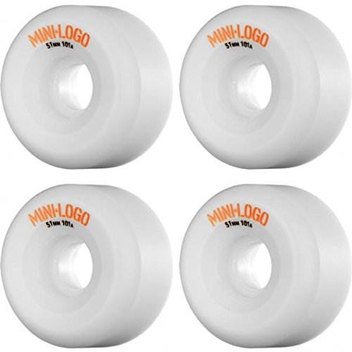 -. Brand : Mini-Logo -. Color : White -. EAN : 0715050349596 -. Feature : One (1) set of 51mm Mini Logo A-Cut Skateboard Wheels; includes four (4) wheels / Diameter: 51mm / Durometer: 101a / Color: White -. Label : Mini Logo -. Manufacturer : Mini Logo -. MPN : 1WMIN0CA51101WO -. PackageQuantity : 1 -. PartNumber : 1WMIN0CA51101WO -. ProductGroup : Sports -. ProductTypeName : OUTDOOR_RECREATION_PRODUCT -. Publisher : Mini Logo -. Studio : Mini Logo -. Title : Mini Logo A-Cut White Skateboard Wheels - 51mm 101a (Set of 4) -. UPC : 715050349596