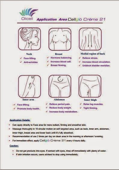 如果您把 Cellglò Crème 21 涂抹在个穴位上,然后轻轻按摸,营养会从皮肤真皮层渗透进体内的微血管里。这些渗透进血液内的营养会改善体内的血液循环和气流, 让它们运作得更顺畅。当血和气流改善以后,整个身体的功能也将被改善。